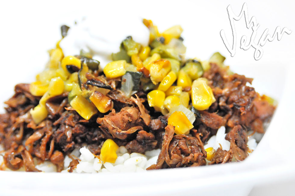 Rice, carnitas, corn and zucchini mix, drop of sour cream