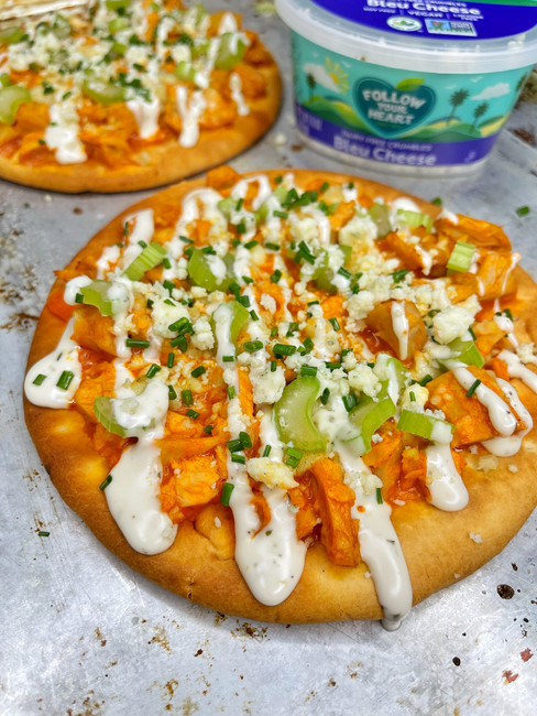 Today we are making a delicious and easy flatbread pizza with a perfect buffalo chicken mix and bleu cheese crumbles. The flavors pair so well together. And then finished with refreshing celery, ranch and chives. Can we say YUM!!!