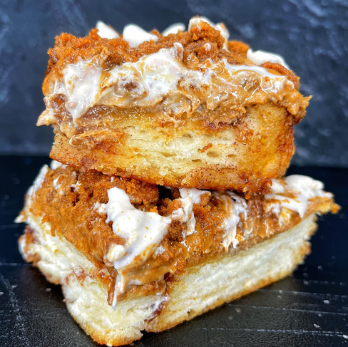 A delicious and unique dessert using vegan friendly canned biscuit dough tossed in cinnamon and sugar, spread with Biscoff cookie butter and topped with cookie crumbles and white chocolate chips! This dessert is very versatile and you can change up with toppings to make it how you like.